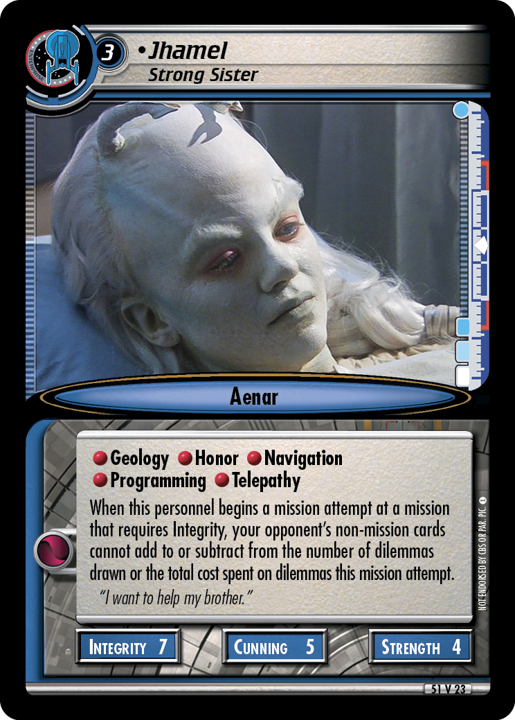 When this personnel begins a mission attempt at a mission that requires Integrity, your opponent's non-mission cards cannot add to or subtract from the number of dilemmas drawn or the total cost spent on dilemmas this mission attempt.