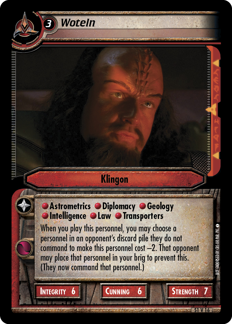When you play this personnel, you may choose a personnel in an opponent's discard pile they do not command to make this personnel cost -2. That opponent may place that personnel in your brig to prevent this. (They now command that personnel.)