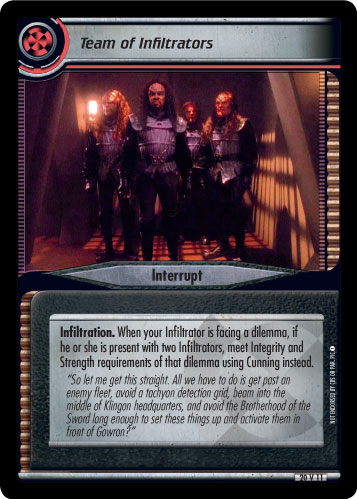Infiltration. When your Infiltrator is facing a dilemma, if he or she is present with two Infiltrators, meet Integrity and Strength requirements of that dilemma using Cunning instead.