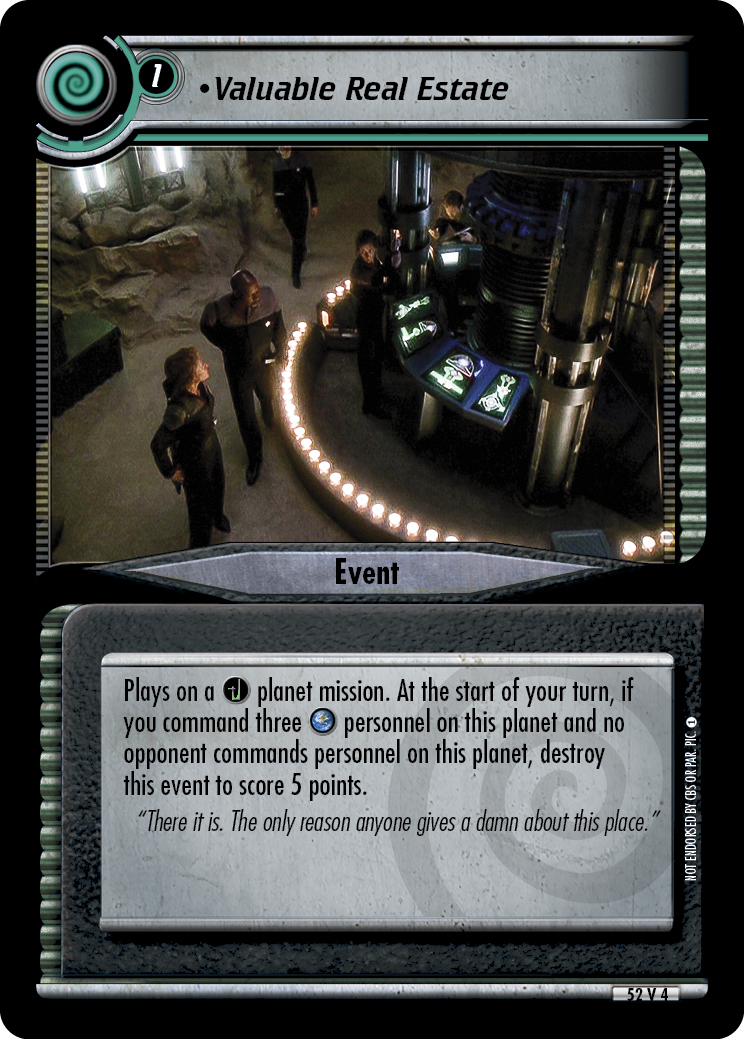 Plays on a [Dom] planet mission. At the start of your turn, if you command three [E] personnel on this planet and no opponent commands personnel on this planet, destroy this event to score 5 points.