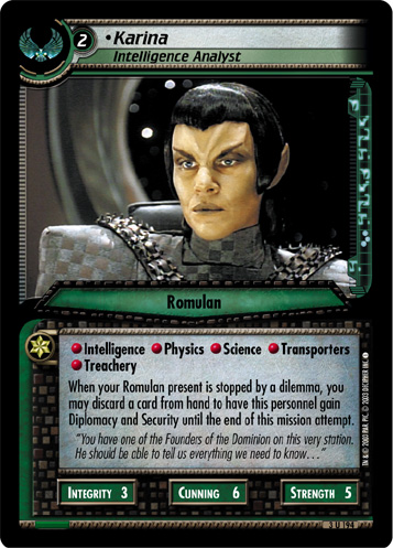 When your Romulan present is stopped by a dilemma, you may discard a card from hand to have this personnel gain Diplomacy and Security until the end of this mission attempt.