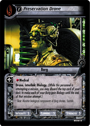 Drone. Interlink: Biology. (While this personnel is attempting a mission, you may discard the top card of your deck to make each of your Borg gain Biology until the end of that mission attempt.)
