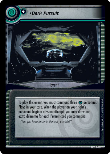 To play this event, you must command three [Rom] personnel. Plays in your core. When the player on your right's personnel begin a mission attempt, you may draw one extra dilemma for each Pursuit card you command.