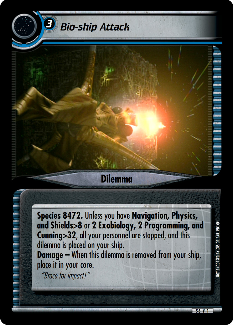 Species 8472. Unless you have Navigation, Physics, and Shields>8 or 2 Exobiology, 2 Programming and Cunning>32, all your personnel are stopped, and this dilemma is placed on your ship.