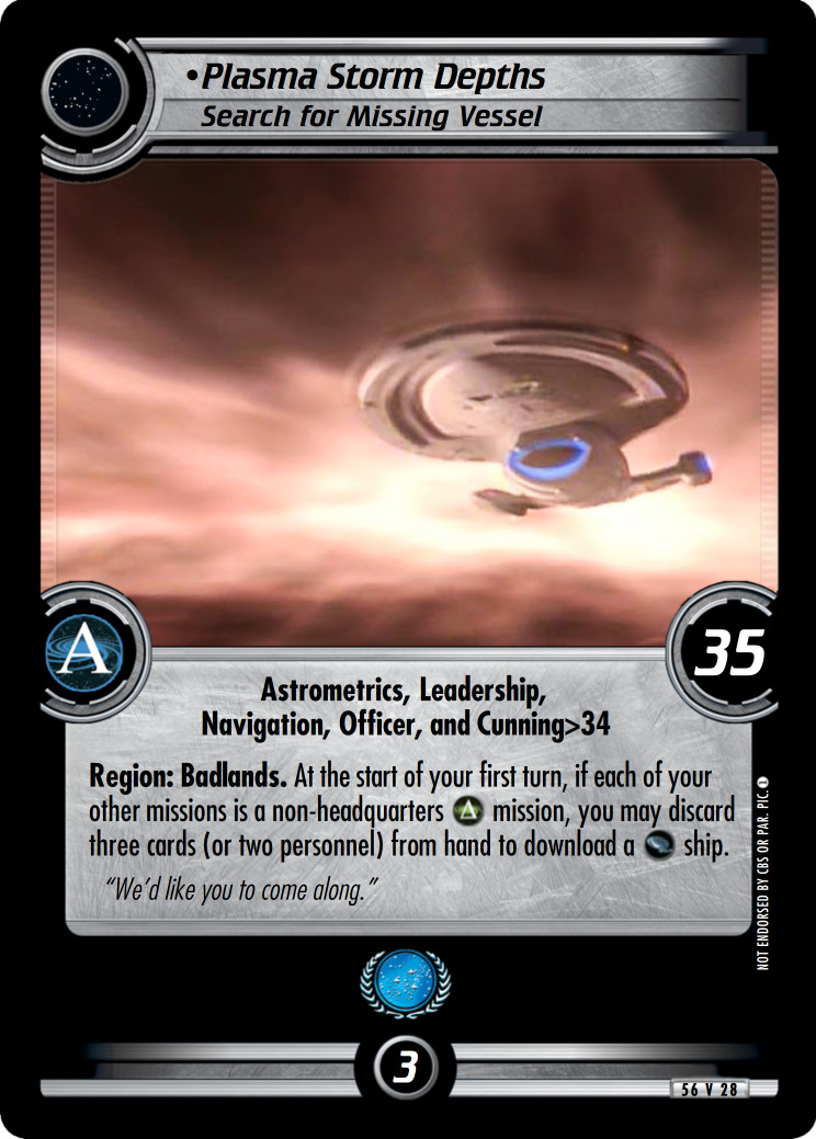 Region: Badlands. At the start of your first turn, if each of your other missions is a non-headquarters [DQ] mission, you may discard three cards (or two personnel) from hand to download a [Voy] ship.