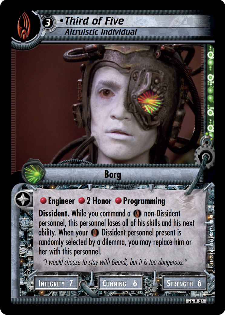Dissident. While you command a [Bor] non-Dissident personnel, this personnel loses all of his skills and his next ability. When your [Bor] Dissident personnel present is randomly selected by a dilemma, you may replace him or her with this personnel.