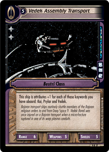 This ship is attributes +1 for each of these keywords you have aboard: Kai, Prylar and Vedek.