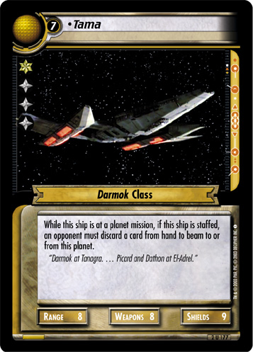 While this ship is at a planet mission, if this ship is staffed, an opponent must discard a card from hand to beam to or from this planet.