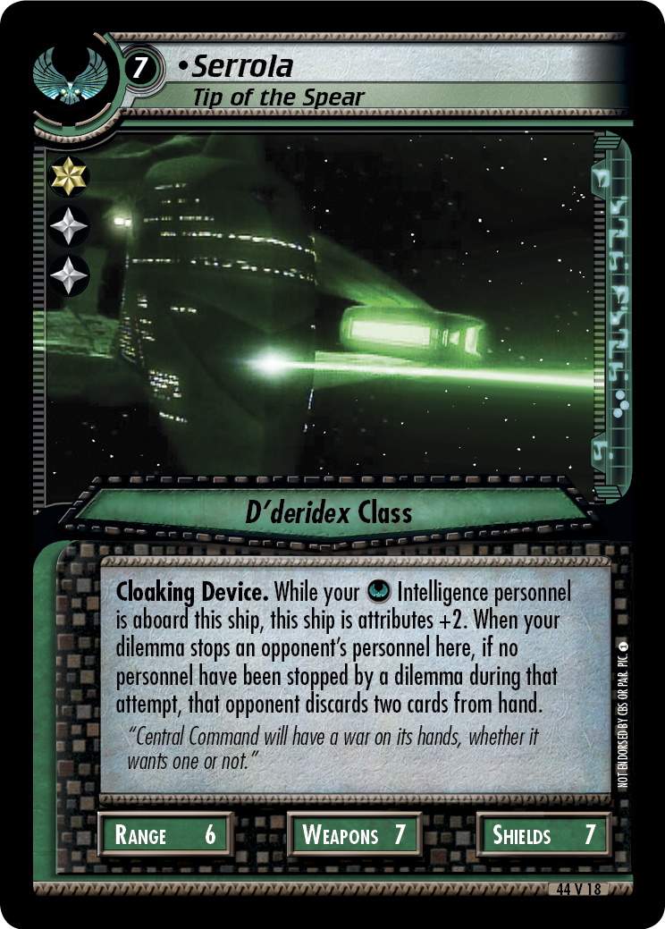 Cloaking Device. While your [Rom] Intelligence personnel is aboard this ship, this ship is attributes +2. When your dilemma stops an opponent's personnel here, if no personnel have been stopped by a dilemma during that attempt, that opponent discards two cards from hand.