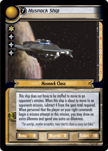 This ship does not have to be staffed to move to an opponent's mission. When this ship is about to move to an opponent's mission, subtract 4 from the span total required. When personnel that the player on your right commands begin a mission attempt at this mission, you may draw an extra dilemma and spend one extra on dilemmas.