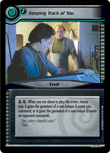 Q. Q. When you are about to play this event, choose one: it gains the gametext of a non-unique Q event you command; or it gains the gametext of a non-unique Q event an opponent commands.