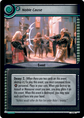 Decay: 2. (When there are two cards on this event, destroy it.) To play this event, you must command three [Kli] personnel. Plays in your core. When you destroy an Assault or Maneuver event you own, you may place it on this event. When this event is destroyed, you may take each card here into your hand.