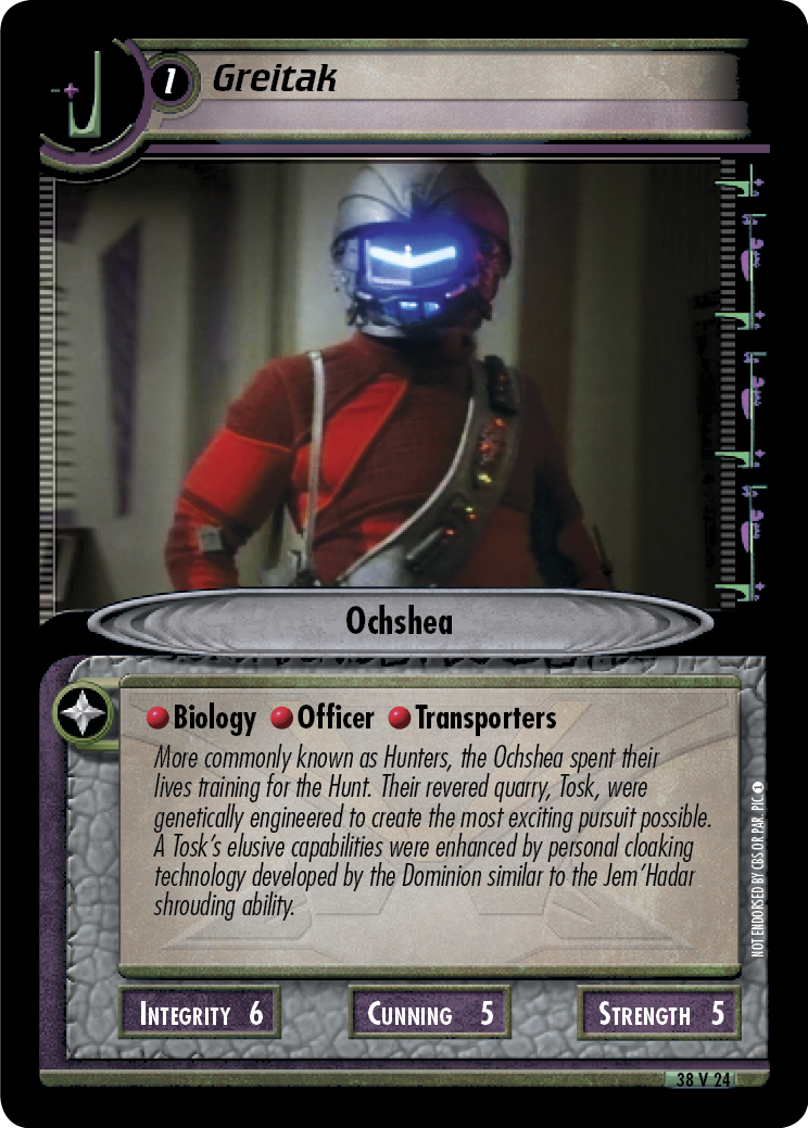 More commonly known as Hunters, the Ochshea spent their lives training for the Hunt. Their revered quarry, Tosk, were genetically engineered to create the most exciting pursuit possible. A Tosk's elusive capabilities were enhanced by personal cloaking technology developed by the Dominion similar to the Jem'Hadar shrouding ability.