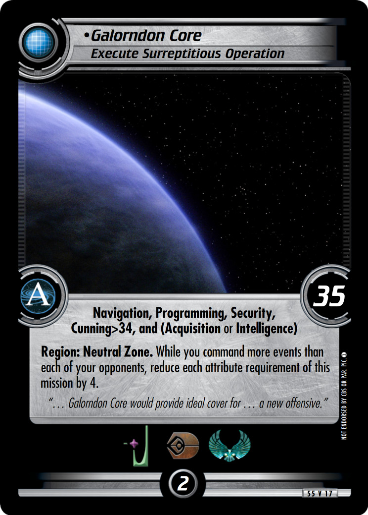 Region: Neutral Zone. While you command more events than each of your opponent, reduce each attribute requirement of this mission by 4.