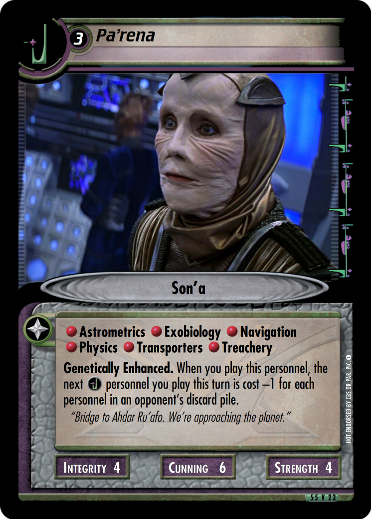 Genetically Enhanced. When you play this personnel, the next [Dom] personnel you play this turn is cost -1 for each personnel in an opponent's discard pile.