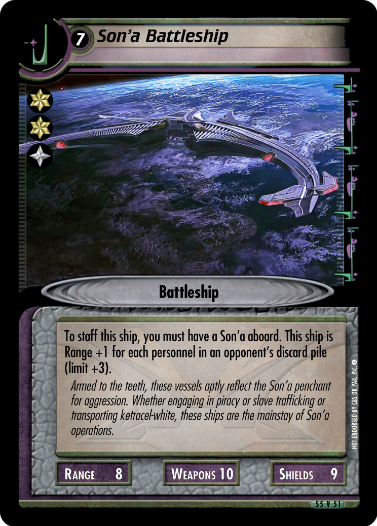 To staff this ship, you must have a Son'a aboard. This ship is Range +1 for each personnel in an opponent's discard pile (limit +3).