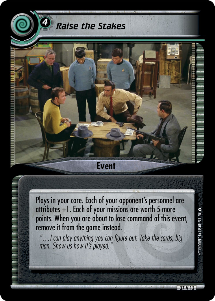 Plays in your core. Each of your opponent's personnel are attributes +1. Each of your missions are worth 5 more points. When you are about to lose command of this event, remove it from the game instead.