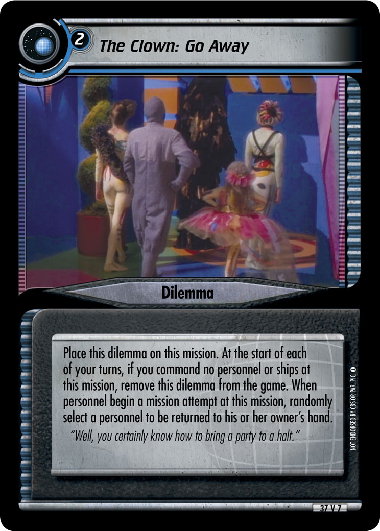Place this dilemma on this mission. At the start of each of your turns, if you command no personnel or ships at this mission, remove this dilemma from the game. When personnel begin a mission attempt at this mission, randomly select a personnel to be returned to its owner’s hand.