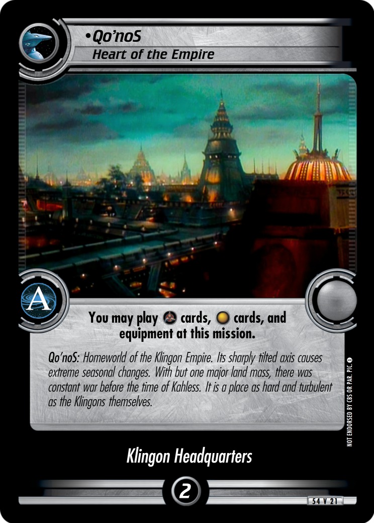 Homeworld of the Klingon Empire. Its sharply tilted axis causes extreme seasonal changes. With but one major land mass, there was constant war before the time of Kahless. It is a place as hard and turbulent as the Klingons themselves.