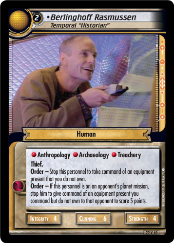 Order - If this personnel is on an opponent's planet mission, stop him to give command of an equipment present you command but do not own to that opponent to score 5 points.