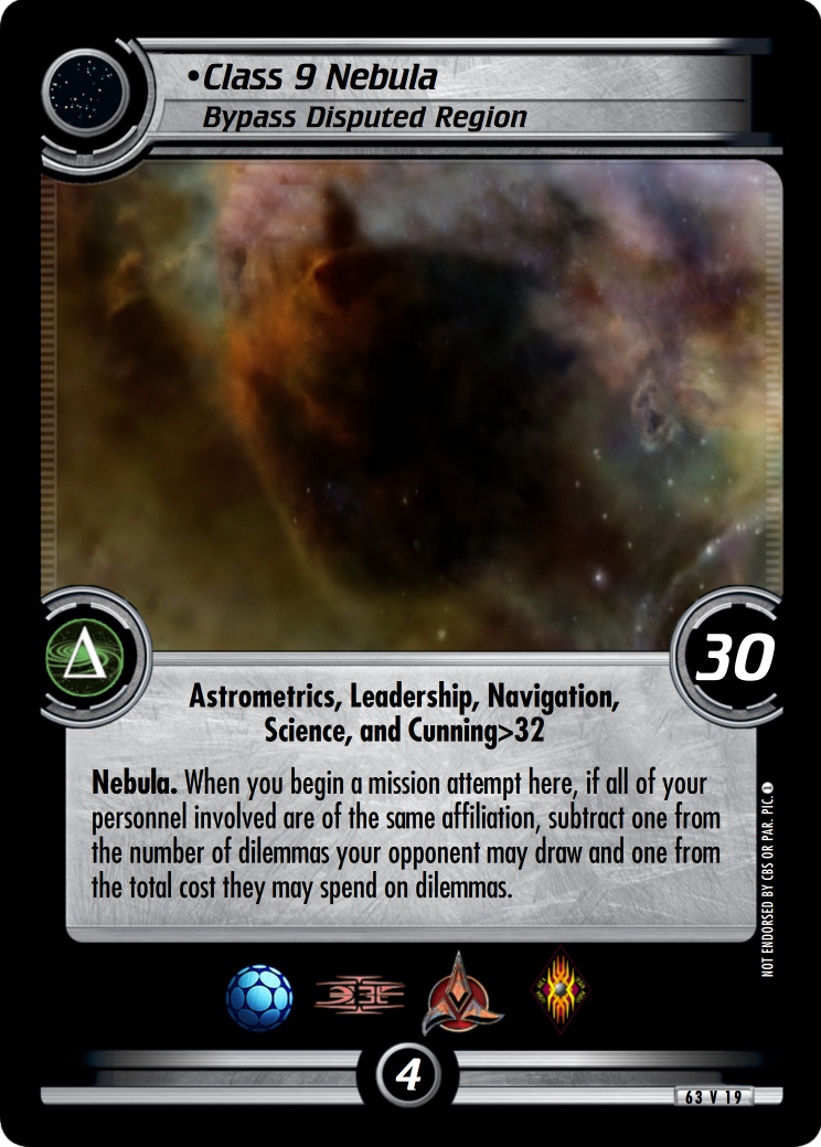 Nebula. When you begin a mission attempt here, if all of your personnel involved are of the same affiliation, subtract one from the number of dilemmas your opponent may draw and one from the total cost they may spend on dilemmas.