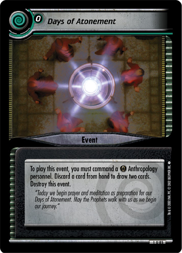 To play this event, you must command a [Baj] Anthropology personnel. Discard a card from hand to draw two cards. Destroy this event.