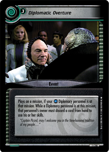 Plays on a mission, if your [Fed] Diplomacy personnel is at that mission. While a Diplomacy personnel is at this mission, that personnel's owner must discard a card from hand to use his or her skills.