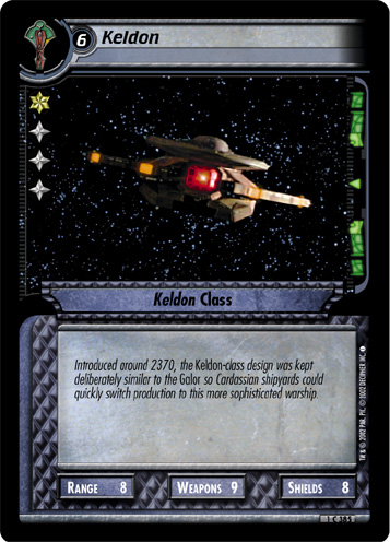 Introduced around 2370, the Keldon-class design was kept deliberately similar to the Galor so Cardassian shipyards could quickly switch production to this more sophisticated warship.