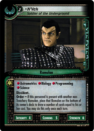 Order - If this personnel is present with another non-Treachery Romulan, place that Romulan on the bottom of its owner's deck to draw a number of cards equal to his or her cost. you may do this only once each turn.