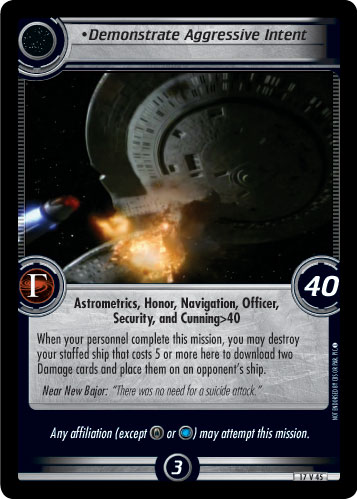When your personnel complete this mission, you may destroy your staffed ship that costs 5 or more here to download two Damage cards and place them on an opponent's ship.