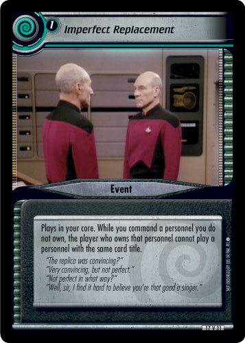 Plays in your core. While you command a personnel you do not own, the player who owns that personnel cannot play a personnel with the same card title.