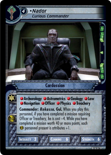 Commander: Rokassa. Gul. When you play this personnel, if you have completed a mission requiring Officer or Treachery, he is cost -4. While you have completed a mission worth 40 or more points each [AU] personnel present is attributes +1.