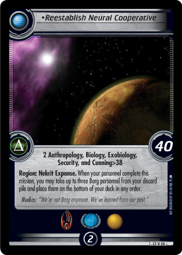 Region: Nekrit Expanse. When your personnel complete this mission, you may take up to three Borg personnel from your discard pile and place them on the bottom of your deck in any order.