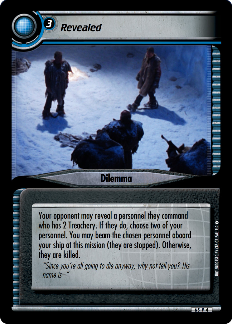 Your opponent may reveal a personnel they command who has 2 Treachery. If they do, choose two of your personnel. You may beam the chosen personnel aboard your ship at this mission. (They are stopped.) Otherwise, they are killed.