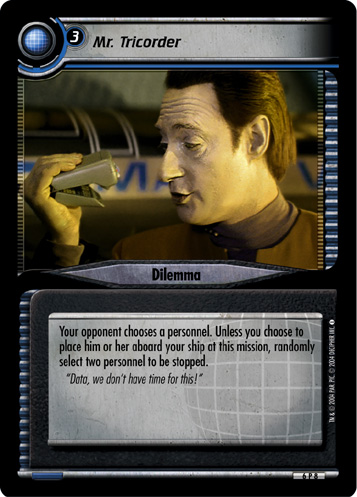 Your opponent chooses a personnel. Unless you choose to place him or her aboard your ship at this mission, randomly select two personnel to be stopped.