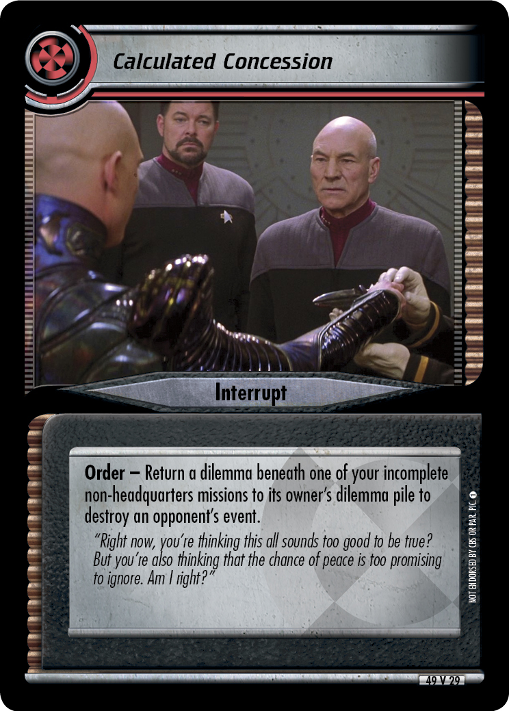 Order - Return a dilemma beneath one of your incomplete non-headquarters mission to its owner's dilemma pile to destroy an opponent's event.