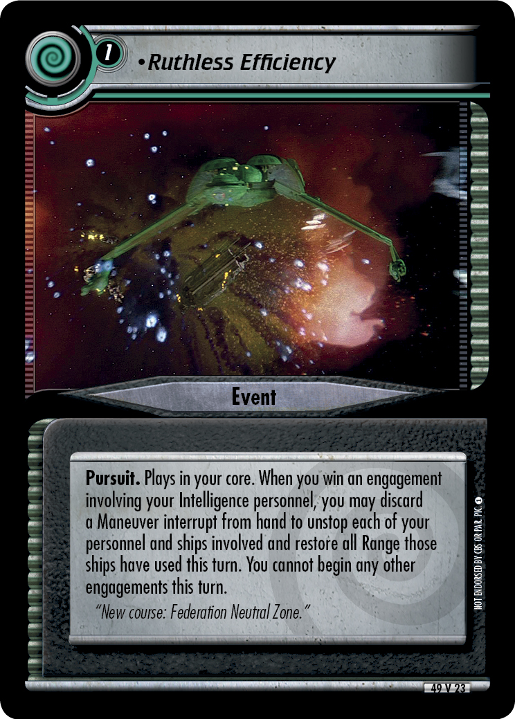 Pursuit. Plays in your core. When you win an engagement involving your Intelligence personnel, you may discard a Maneuver interrupt from hand to unstop each of your personnel and ships involved and restore all Range those ships have used this turn. You cannot begin any other engagements this turn.