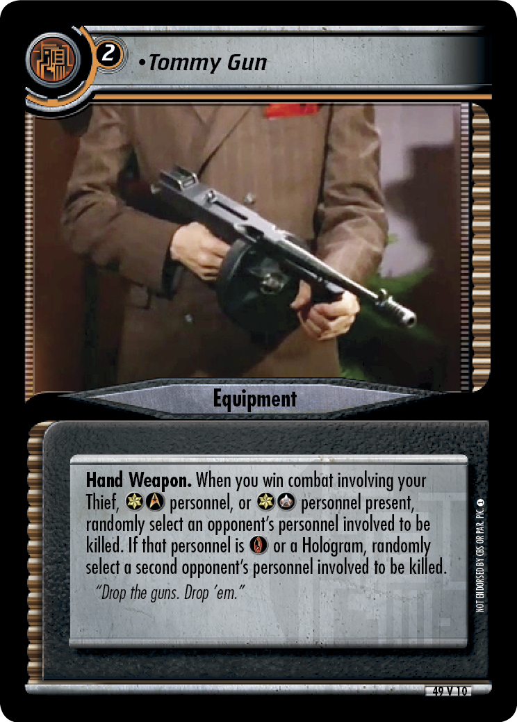 Hand Weapon. When you win combat involving your Thief, [Cmd][TOS] personnel, or [Cmd][TNG] personnel present, randomly select an opponent's personnel involved to be killed. If that personnel is [Bor] or a Hologram, randomly select a second opponent's personnel involved to be killed.