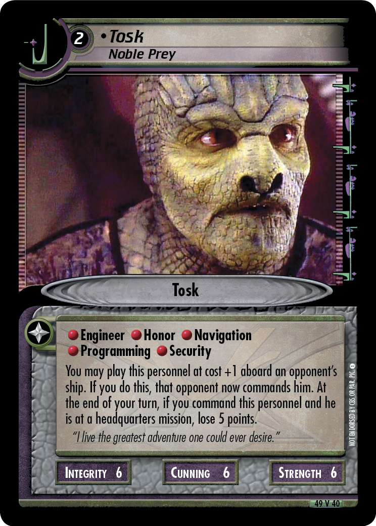 You may play this personnel at cost +1 aboard an opponent's ship. If you do this, that opponent now commands him. At the end of your turn, if you command this personnel and he is at a headquarters mission, lose 5 points.