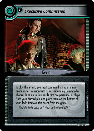 To play this event, you must command a ship at a non-headquarters mission with its corresponding Commander aboard. Take up to four cards that are personnel or ships from your discard pile and place them on the bottom of your deck. Remove this event from the game.