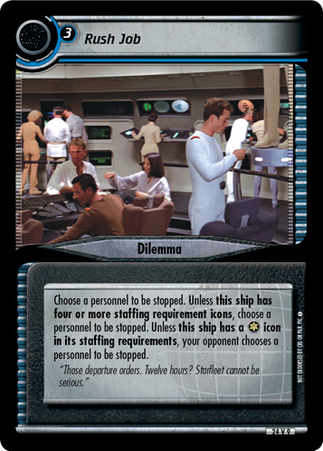 Choose a personnel to be stopped. Unless this ship has four or more staffing requirement icons, choose a personnel to be stopped. Unless this ship has a [Cmd] icon in its staffing requirements, your opponent chooses a personnel to be stopped.