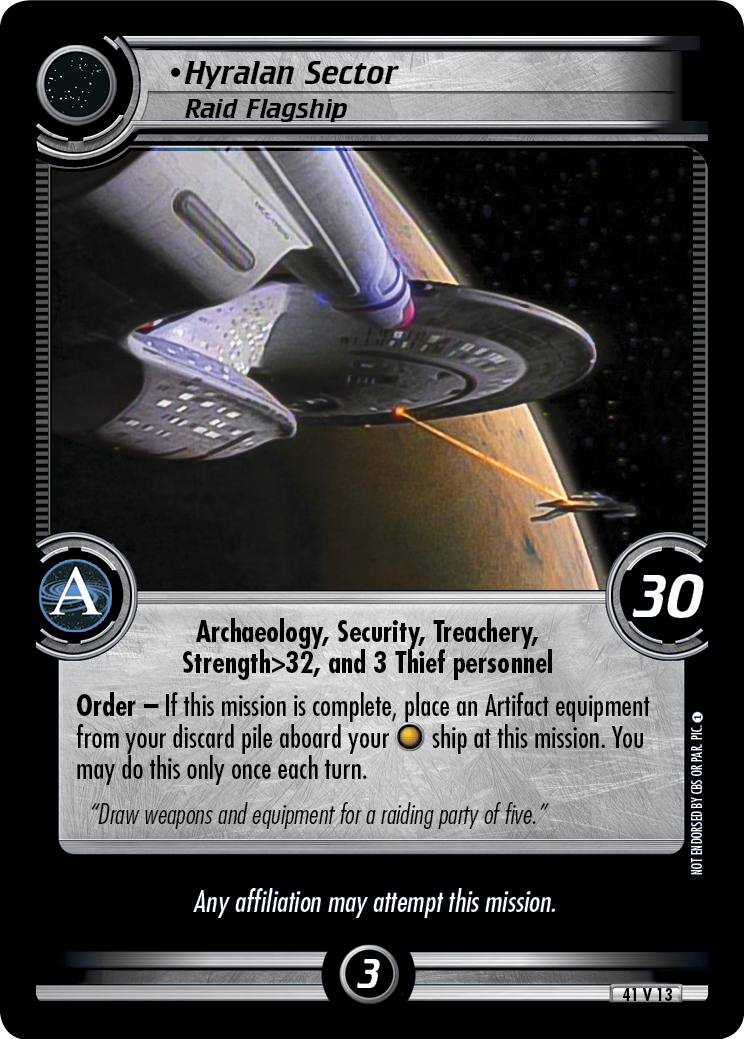 Order - If this mission is complete, place an Artifact equipment from your discard pile aboard your [NA] ship at this mission. You may do this only once each turn.