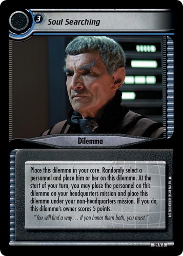 Place this dilemma in your core. Randomly select a personnel and place him or her on this dilemma. At the start of your turn, you may place the personnel on this dilemma at your headquarters mission and place this dilemma under your non-headquarters mission. If you do, the dilemma's owner scores 5 points.