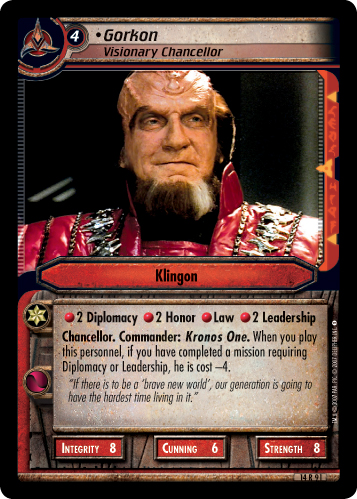 Chancellor. Commander: Kronos One. When you play this personnel, if you have completed a mission requiring Diplomacy or Leadership, he is cost -4.