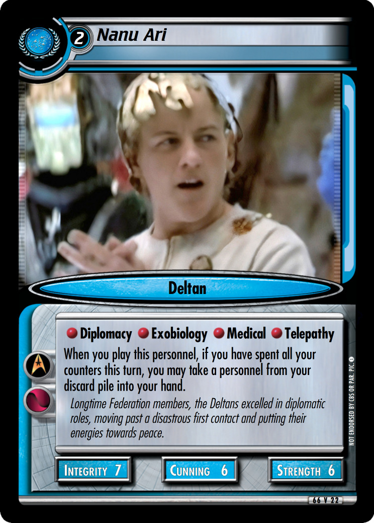 Longtime Federation members, the Deltans excelled in diplomatic roles, moving past a disastrous first contact and putting their energies towards peace.