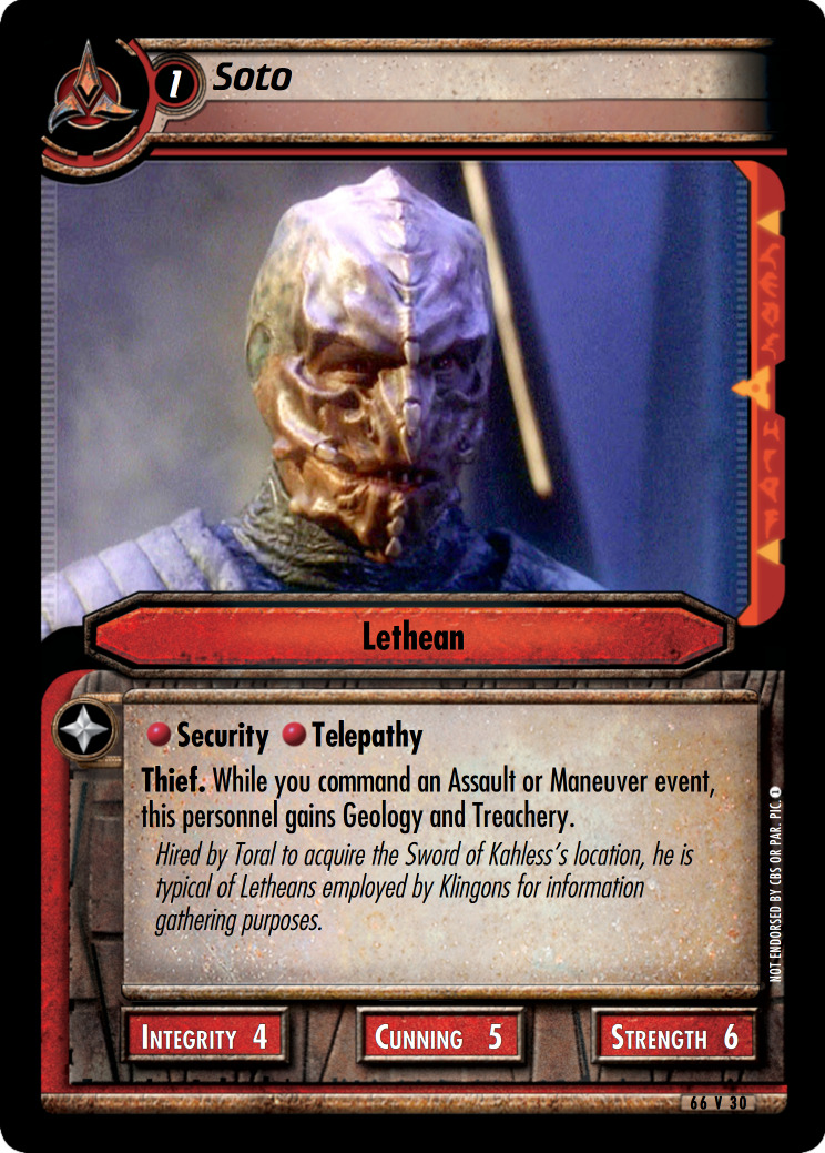 Hired by Toral to acquire the Sword of Kahless's location, he is typical of Letheans employed by Klingons for information gathering purposes.