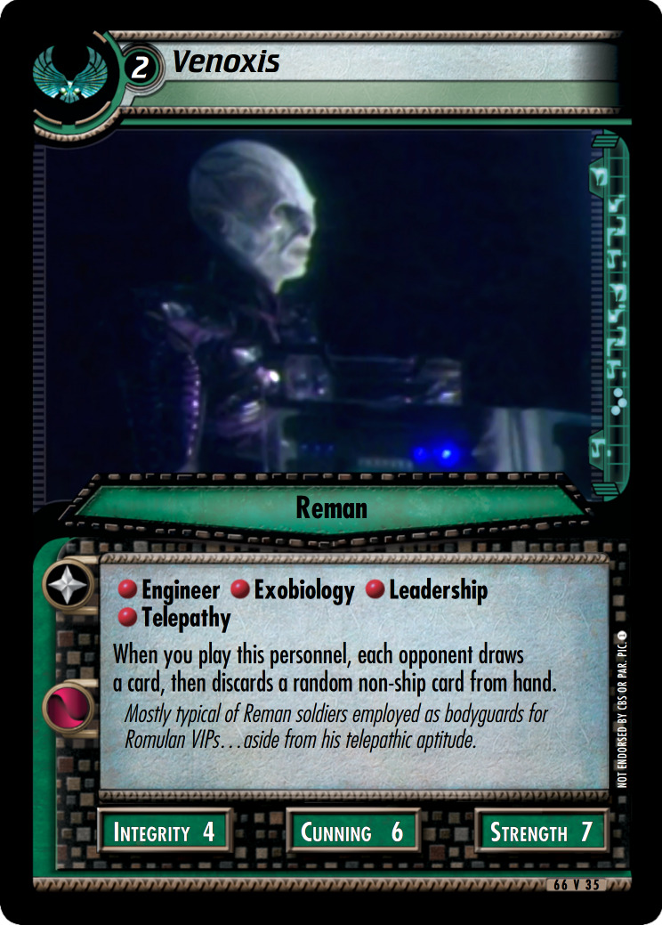 When you play this personnel, each opponent draws a card, then discards a random non-ship card from hand.